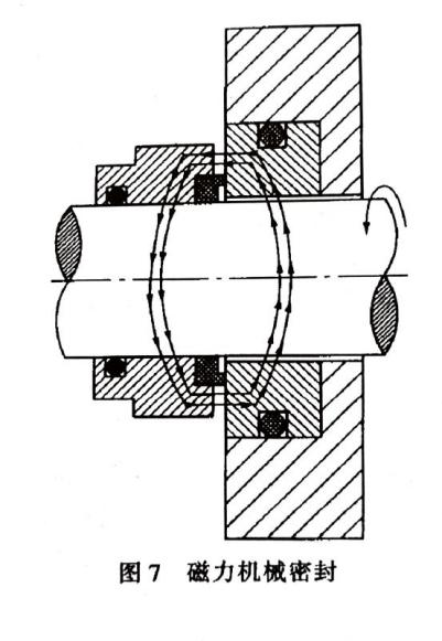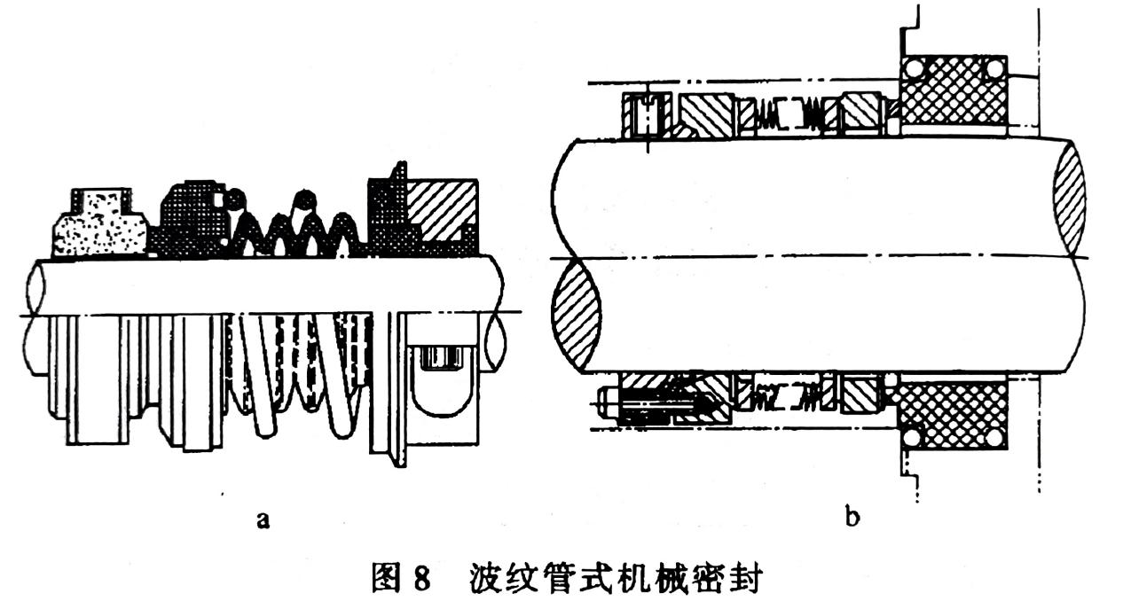 補(bǔ)償結(jié)構(gòu)的作用是使密封端面緊密貼合,為達(dá)到此目的,選用的辦法有兩種,一是彈性力,二是磁力。只有在系統(tǒng)內(nèi)壓力較低時(shí)采用磁力機(jī)械密封(圖7),大多數(shù)都用前者。除了用彈簧形成彈性力外還有用波紋管的,稱為波紋管式機(jī)械密封。波紋管的材質(zhì)可用橡膠、聚四氟乙烯(圖8a)和焊接的金屬薄片等(圖8b)。