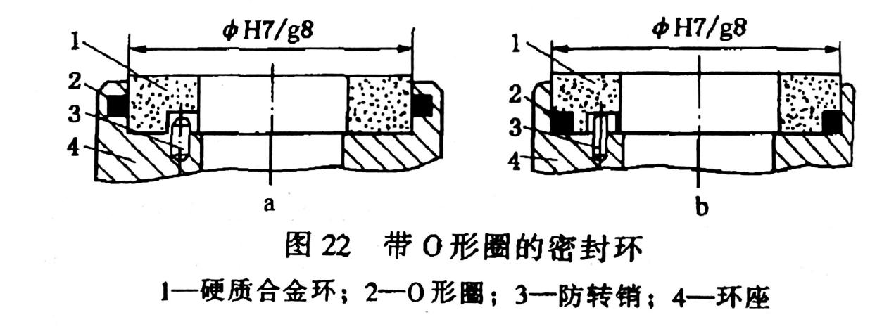 這種組合式密封環(huán)在硬質合金環(huán)與環(huán)座之間用H7/g8的滑動配合。在兩者配合的圓柱面間放置一聚四氟乙烯或合成橡膠制成的O形密封圈,避免其間的密封流體泄露,并且將硬質合金環(huán)與環(huán)座結合在一起。在硬質合金環(huán)與環(huán)座的平面結合處設一銷釘,以傳遞扭矩。此種組合結構,沒有組合應力產(chǎn)生,也無由此引起的組合密封環(huán)的密封端面的變形,可是組合密封環(huán)零件的數(shù)量增加了,還需要在硬質合金環(huán)上鉆孔或槽,給制造提高了難度,另外由于增設了O形圈,密封環(huán)的使用溫度受到了限制。