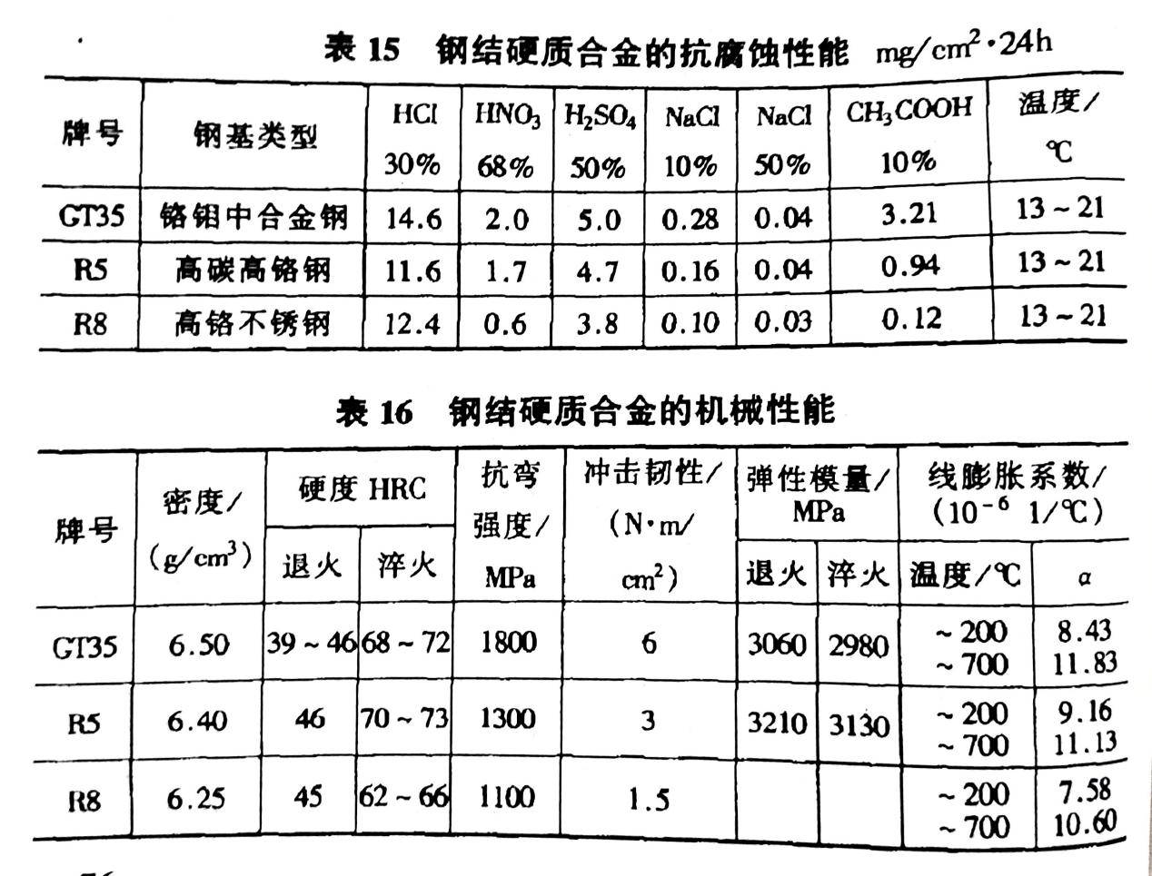 鋼結(jié)硬質(zhì)合金的耐腐蝕性能隨鋼基的類型不同而異。它們?cè)诤K蛪A液中的耐蝕性較好,在其他介質(zhì)中的耐蝕情況和機(jī)械性能見(jiàn)表 15、16。