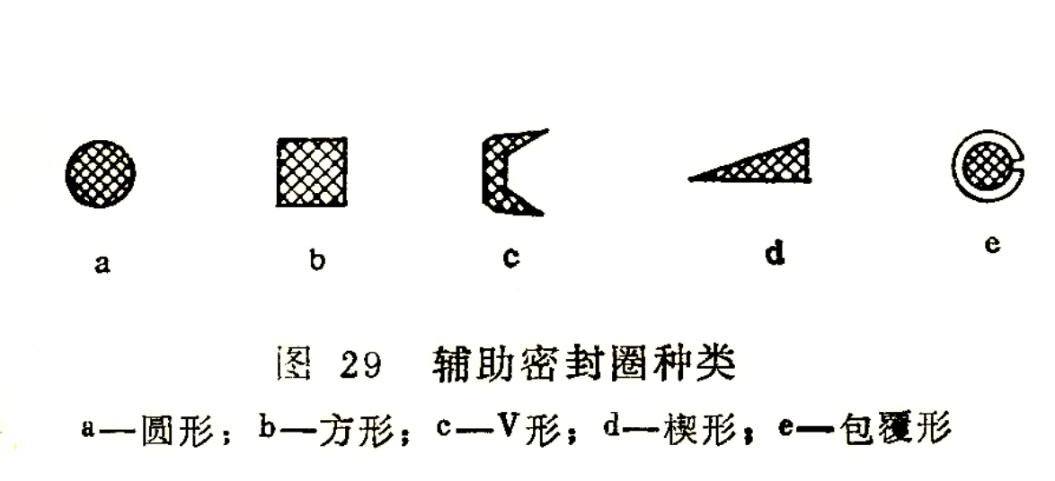 動環(huán)和軸(軸套)以及靜環(huán)和壓蓋之間的密封靠輔助密封圈來實(shí)現(xiàn)。它們基本上歸于靜密封,當(dāng)密封端面和軸中心線不垂直時(shí),動環(huán)密封圈沿軸向有很小的運(yùn)動位移,其移動量取決于密封端面和軸中心的垂直度誤差、運(yùn)動的次數(shù)和軸轉(zhuǎn)速等。輔助密封圈的種類有很多,從材質(zhì)角度分類有合成橡膠、聚四氟乙烯和柔性石墨等;從斷面形狀分類有圓形、方形、V形、楔形及包覆形密封圈(圖29)。