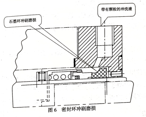 ◆原因分析過(guò)高的沖洗速度或沖洗孔的位置不當(dāng),以及沖洗液中含有顆粒都可能使密封環(huán)受到?jīng)_刷磨損(圖6)。