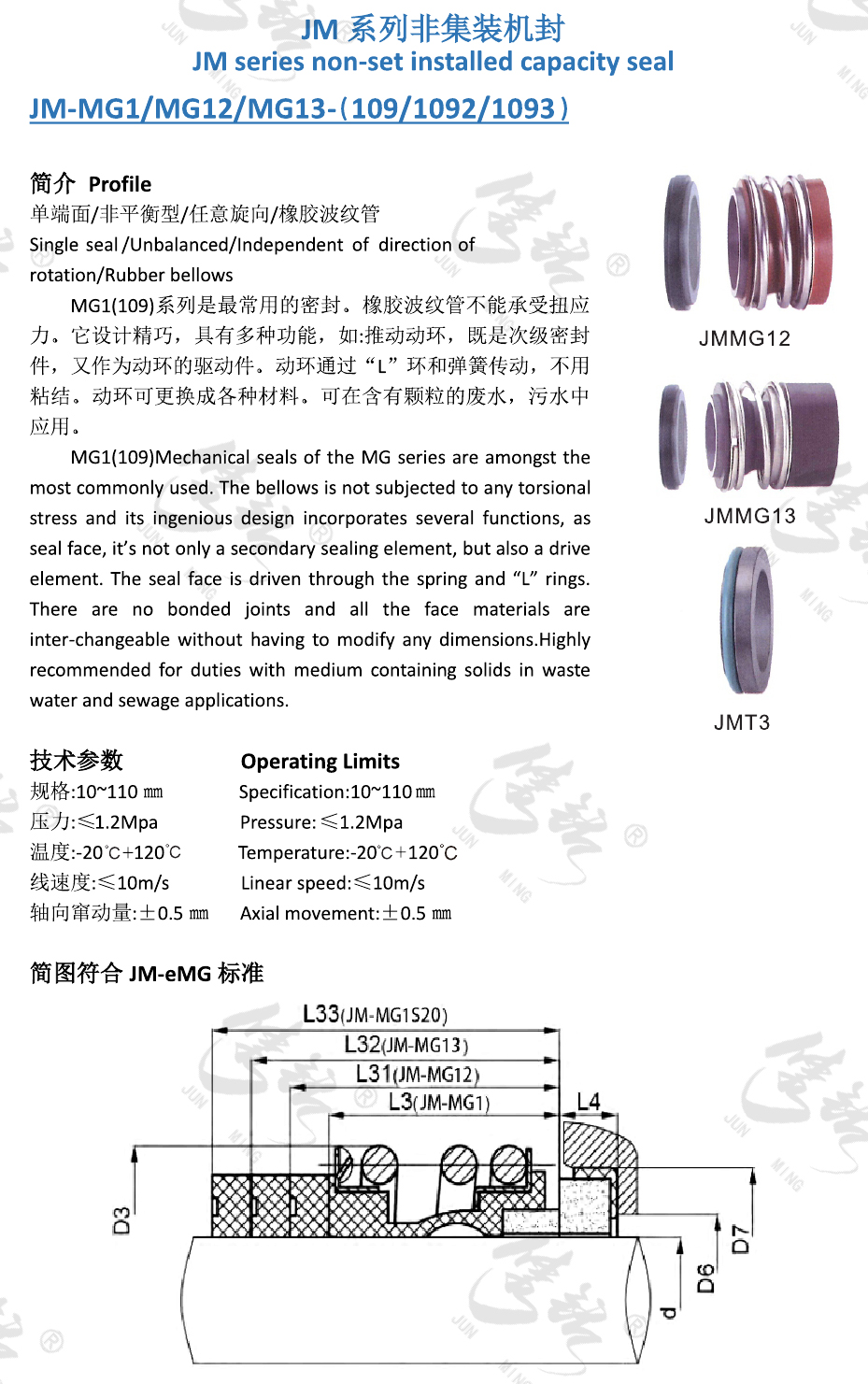 MG1(109)系列是最常用的密封。橡膠波紋管不能承受扭應(yīng)力。它設(shè)計(jì)精巧,具有多種功能,如:推動(dòng)動(dòng)環(huán),既是次級(jí)密封件,又作為動(dòng)環(huán)的驅(qū)動(dòng)件。動(dòng)環(huán)通過“L”環(huán)和彈簧傳動(dòng),不用粘結(jié)。動(dòng)環(huán)可更換成各種材料。可在含有顆粒的廢水,污水中應(yīng)用。