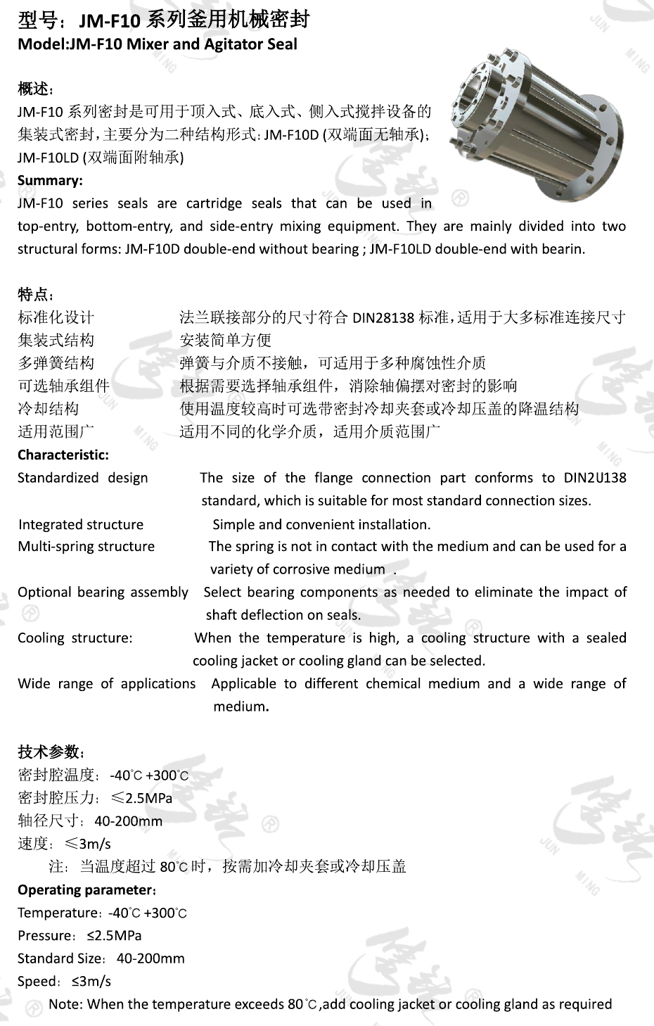 JM-F10系列密封是可用于頂入式、底入式、側(cè)入式攪拌設(shè)備的集裝式密封,主要分為二種結(jié)構(gòu)形式:JM-F10D (雙端面無(wú)軸承);JM-F10LD (雙端面附軸承)