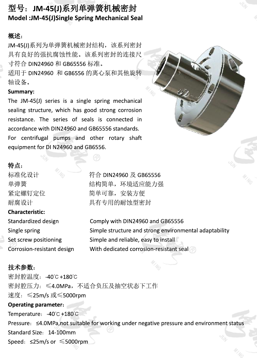 JM-45(J)系列為單彈簧機(jī)械密封結(jié)構(gòu),該系列密封具有良好的強(qiáng)抗腐蝕性能。