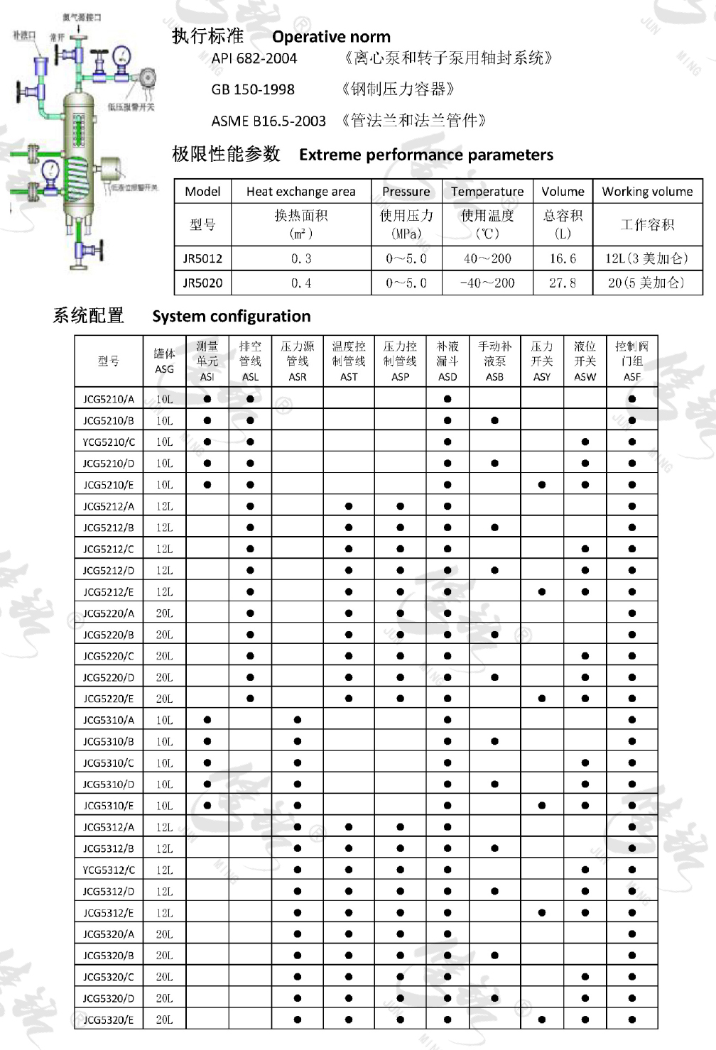 該系列符合API682方案52(無壓)或53A(有壓)系統(tǒng)。當(dāng)機械密封軸徑小于等于60mm時,可選用JR5012系列;當(dāng)機械密封軸徑大于等于60mm時,可選用JR5020系列。