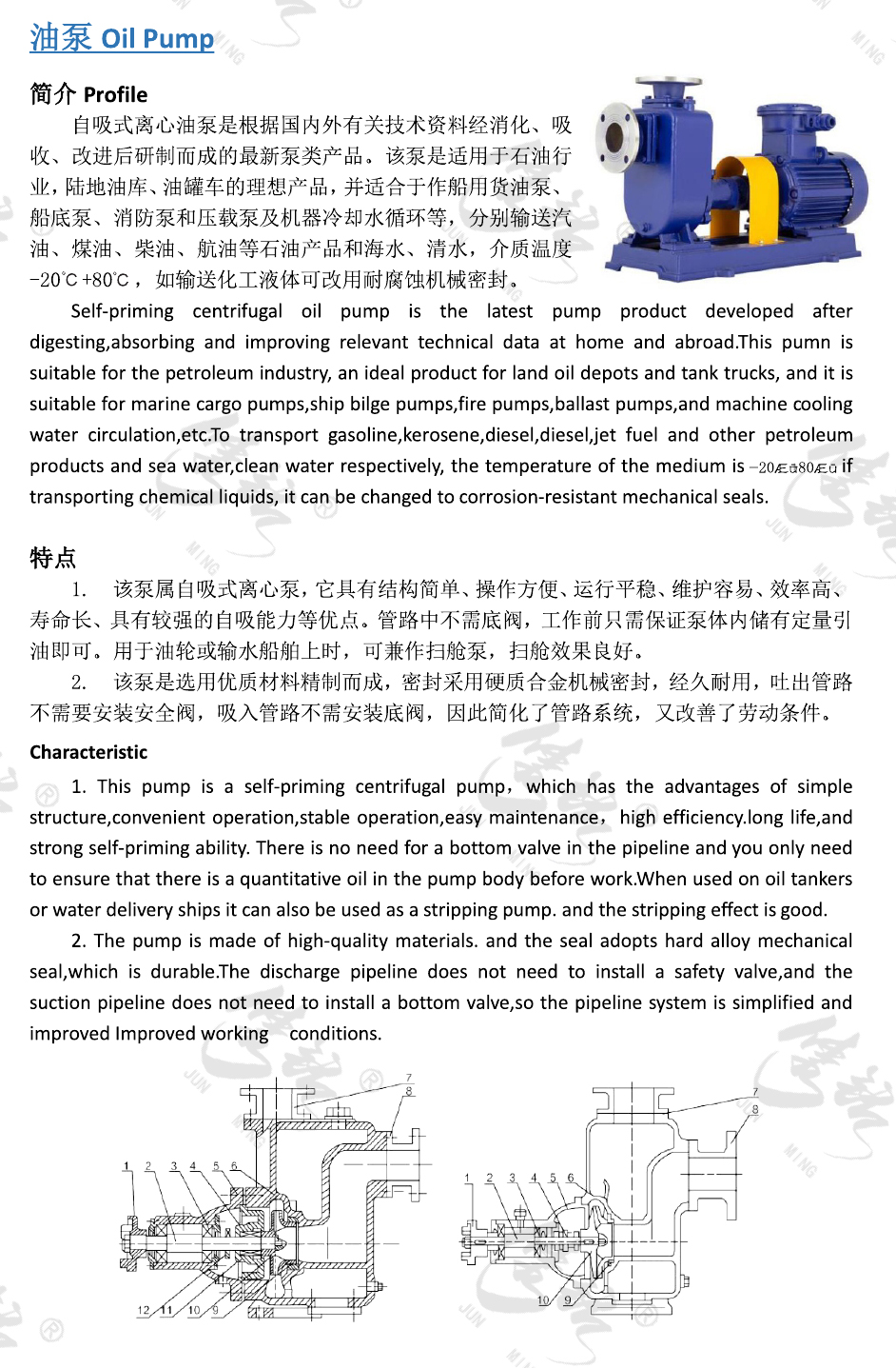 自吸式離心油泵是根據(jù)國(guó)內(nèi)外有關(guān)技術(shù)資料經(jīng)消化、吸收、改進(jìn)后研制而成的最新泵類產(chǎn)品。該泵是適用于石油行業(yè),陸地油庫、油罐車的理想產(chǎn)品,并適合于作船用貨油泵、船底泵、消防泵和壓載泵及機(jī)器冷卻水循環(huán)等,分別輸送汽油、煤油、柴油、航油等石油產(chǎn)品和海水、清水,介質(zhì)溫度-20℃+80℃,如輸送化工液體可改用耐腐蝕機(jī)械密封。