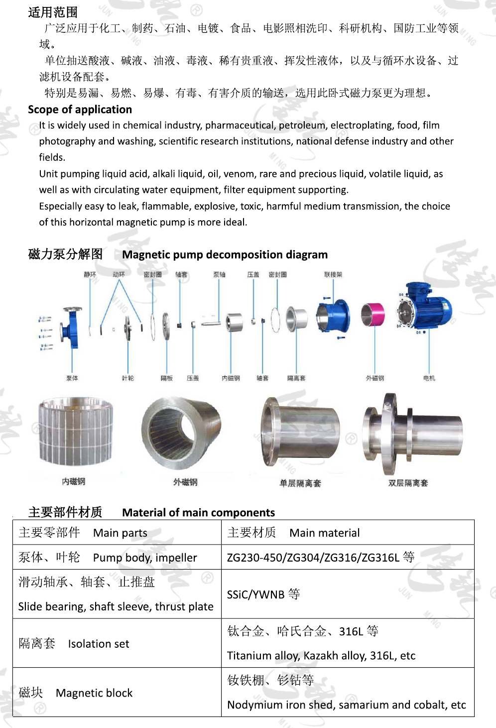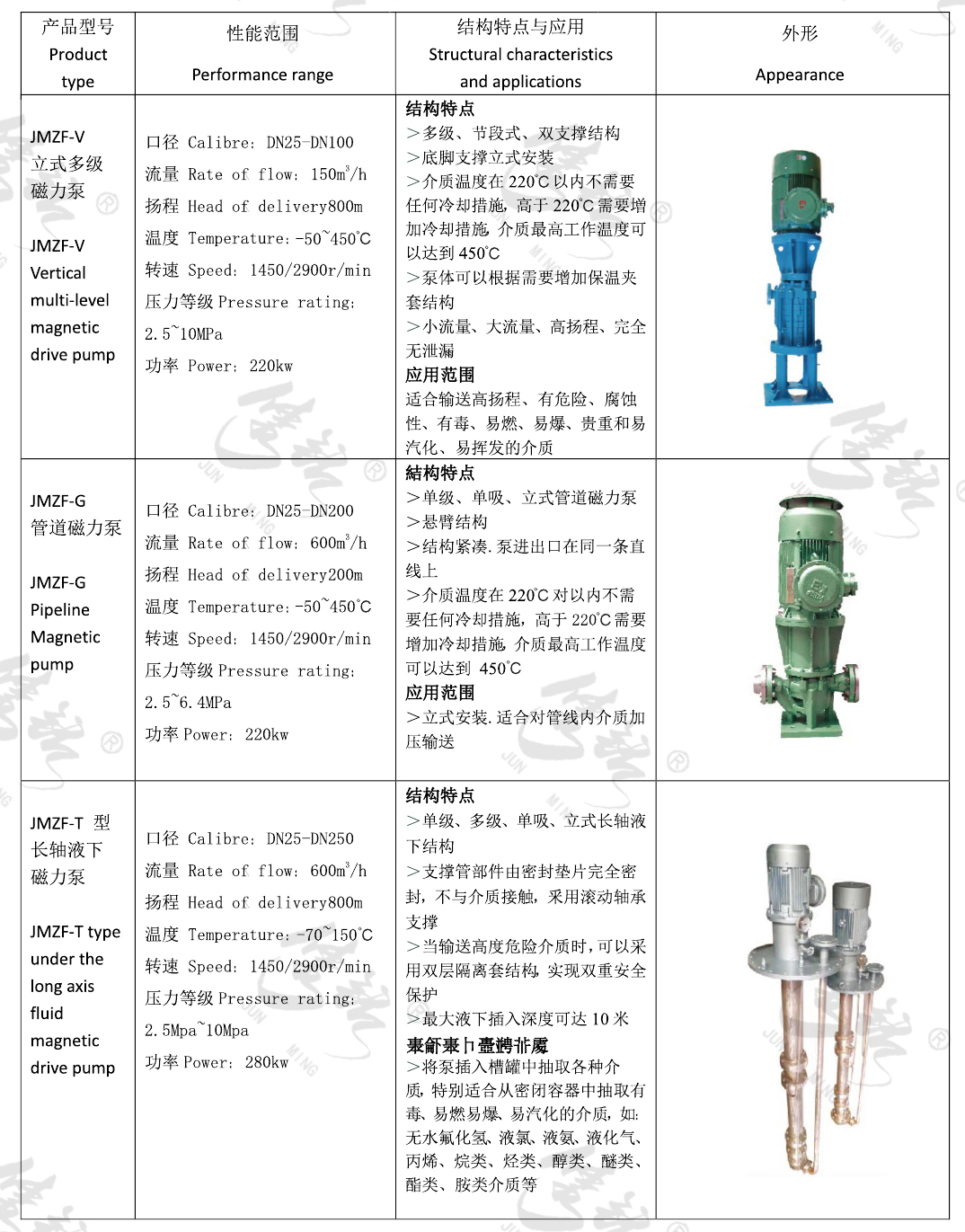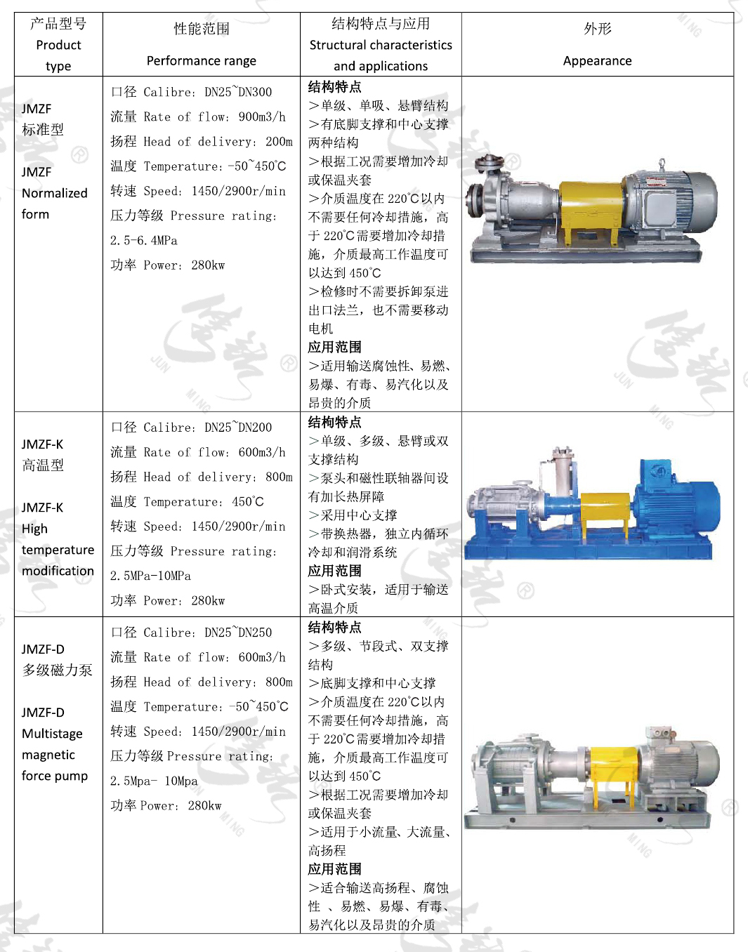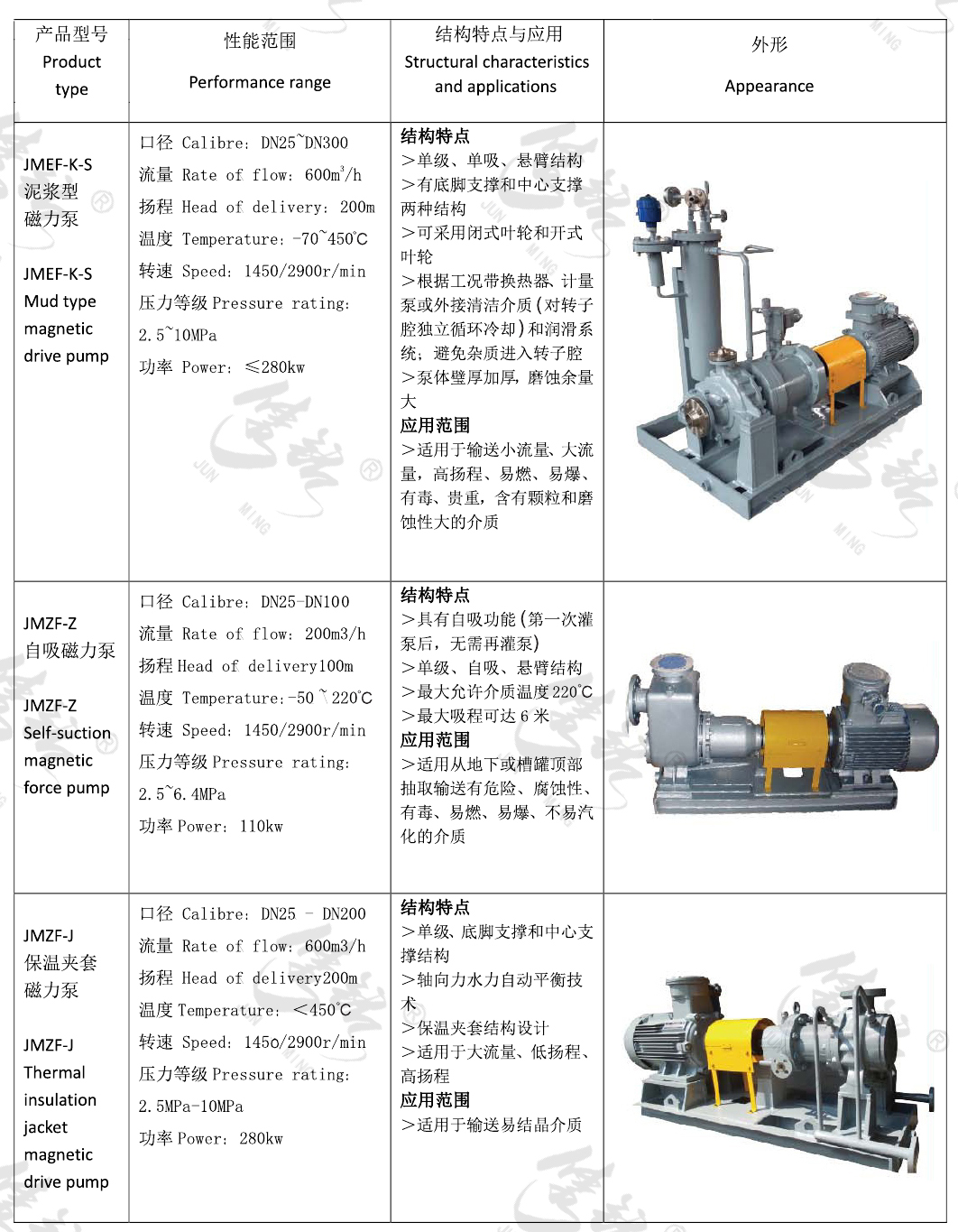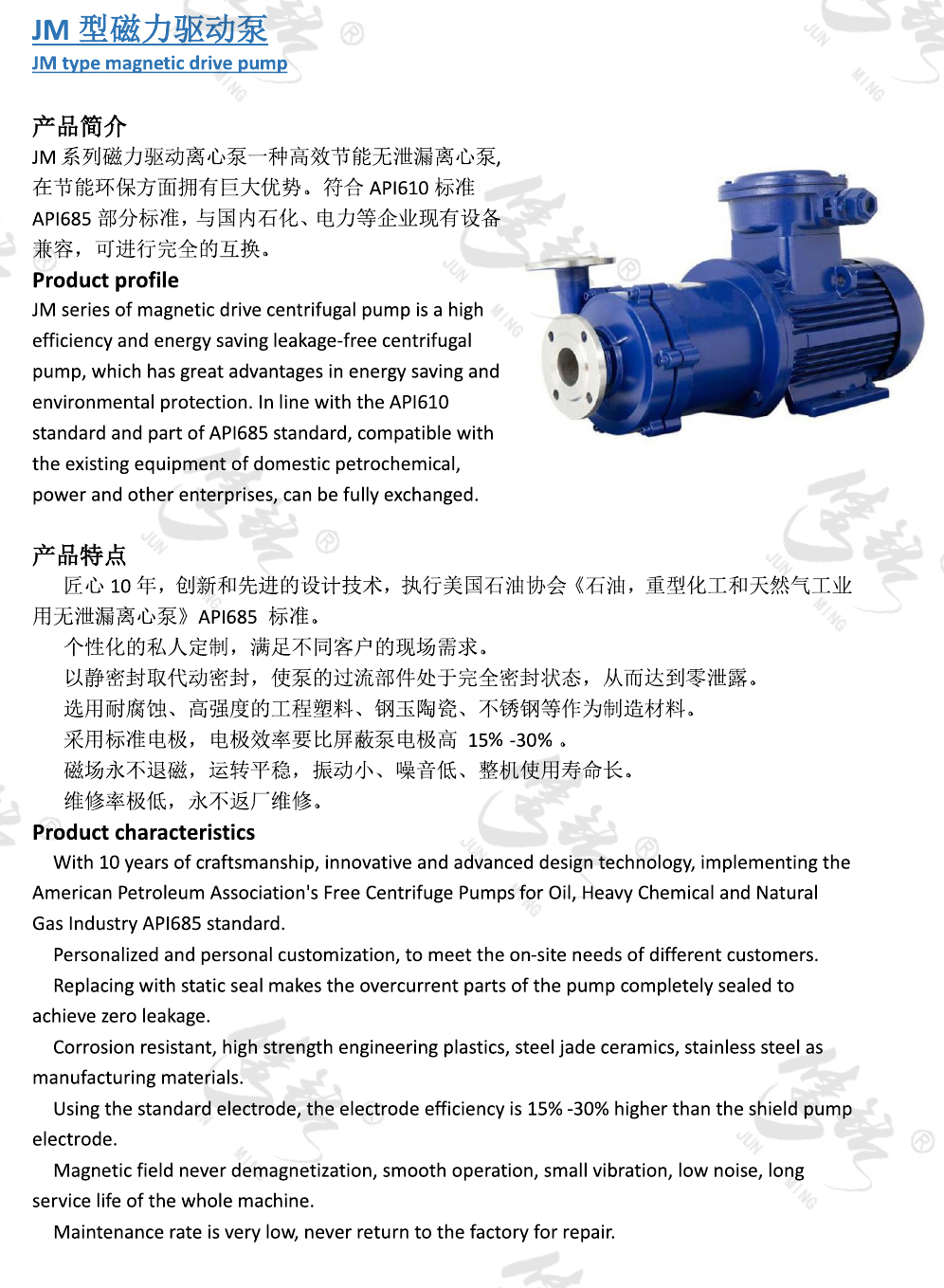 JM系列磁力驅(qū)動離心泵一種高效節(jié)能無泄漏離心泵, 在節(jié)能環(huán)保方面擁有巨大優(yōu)勢。符合API610標(biāo)準(zhǔn)API685部分標(biāo)準(zhǔn),與國內(nèi)石化、電力等企業(yè)現(xiàn)有設(shè)備兼容,可進行完全的互換。
